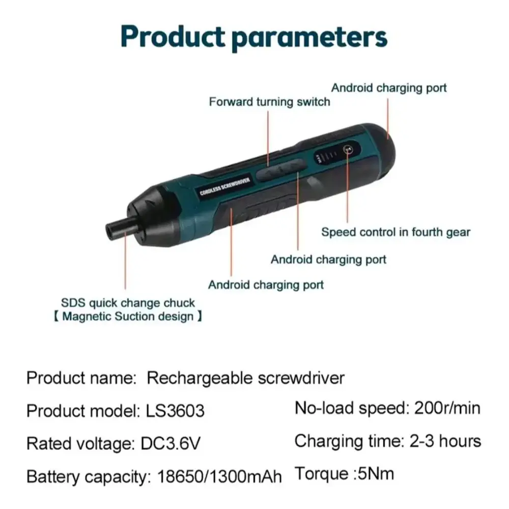 Зручна безшнурова викрутка з вбудованим акумулятором 1300 мА·год і максимальним крутним моментом 5 Н·м – ідеальне рішення для дрібних ремонтних робіт, збирання меблів, ремонту електроніки чи побутової техніки. Оснащена перемикачем напрямку обертання, індикатором заряду та ергономічною рукояткою для комфортної роботи.