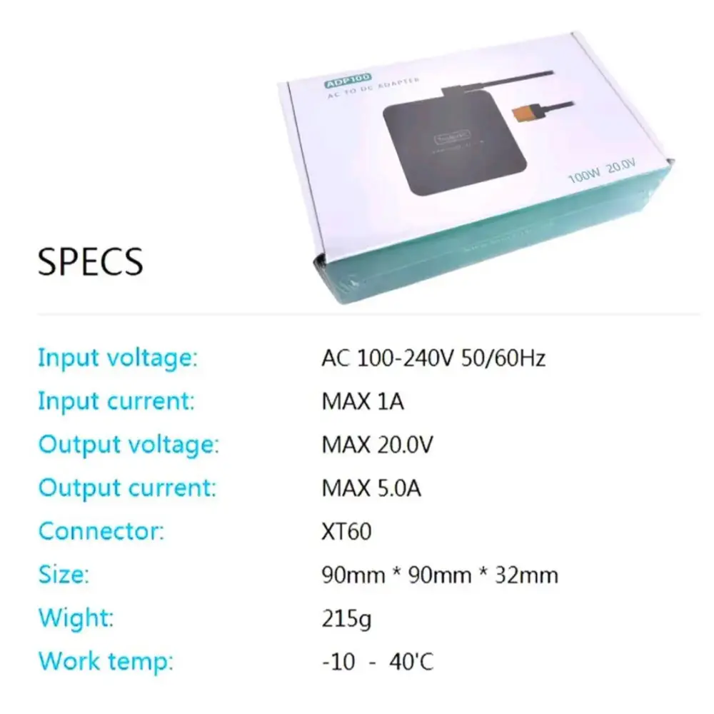ToolkitRC ADP100 — це компактний і потужний адаптер змінного струму (AC) в постійний (DC), спеціально розроблений для живлення зарядних пристроїв, таких як ToolkitRC M6, M8, M6D та інші. Завдяки вихідній потужності 100W і напрузі 20V, адаптер дозволяє стабільно та безпечно заряджати акумулятори FPV-дронів або інші пристрої з живленням через XT60 або DC-роз’єм.