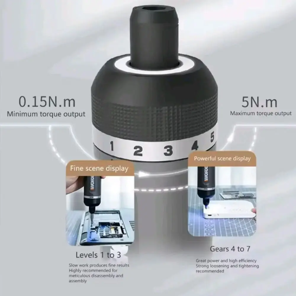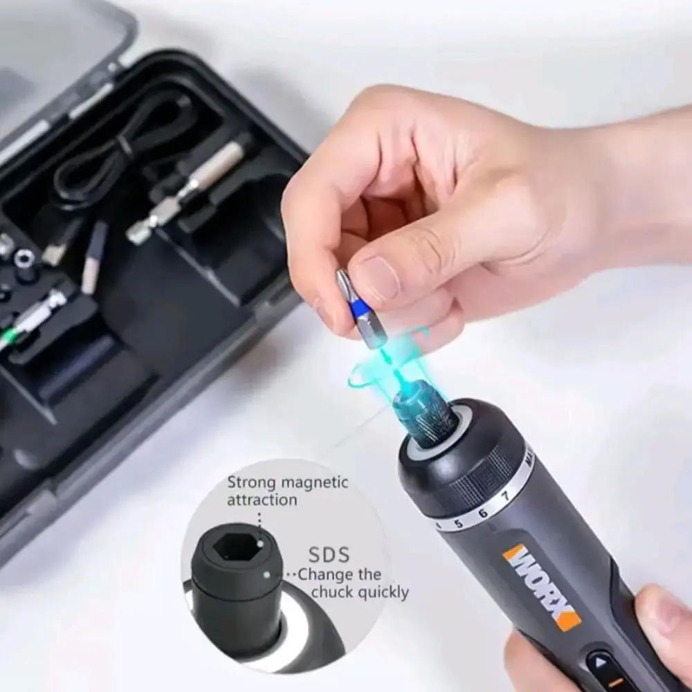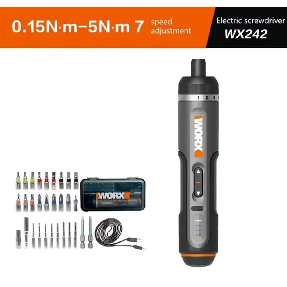 Worx WX242 — сучасна електрична викрутка з високою точністю крутного моменту (від 0.15 до 5 Н·м), 7 рівнями регулювання сили та компактним ергономічним дизайном. Ідеальна для дрібних ремонтних робіт, збірки меблів, електроніки та технічного обслуговування. У комплект входить великий набір біт, подовжувач, кейс та кабель зарядки.