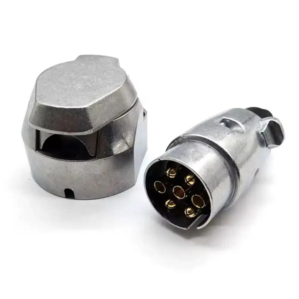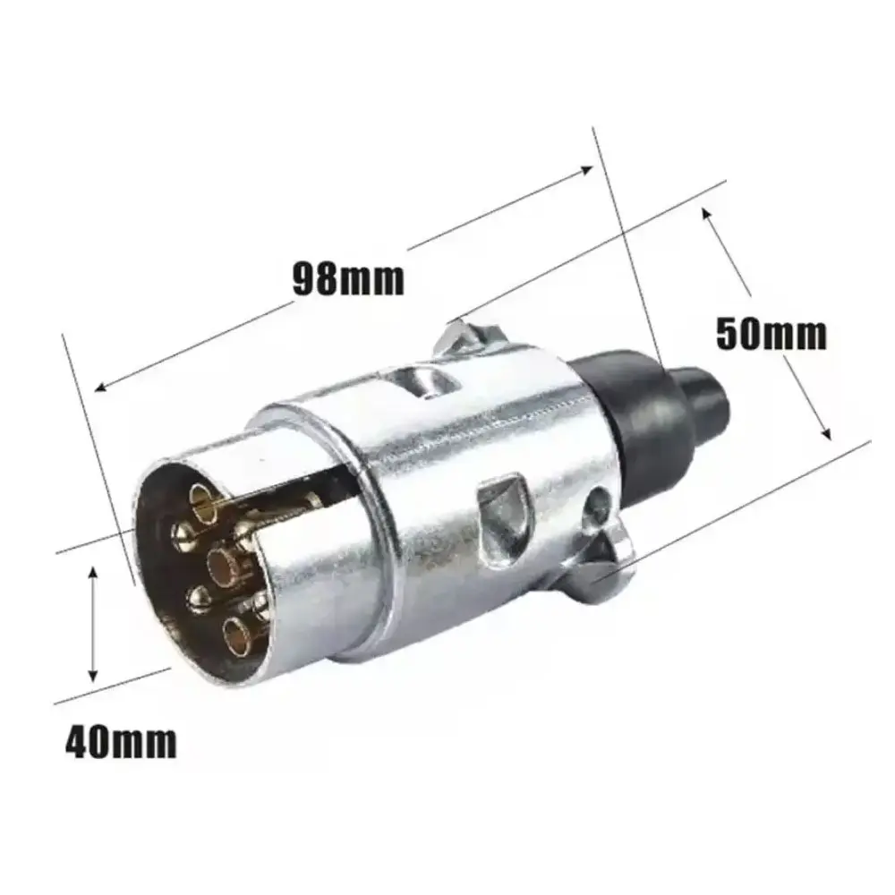 Надійний металевий 7-контактний роз’єм для причепа (тип “євро стандарт”) призначений для підключення електросистеми причепа до автомобіля. Виготовлений з міцного металевого сплаву, стійкого до корозії та механічних пошкоджень, забезпечує стабільний електричний контакт навіть в складних погодних умовах.