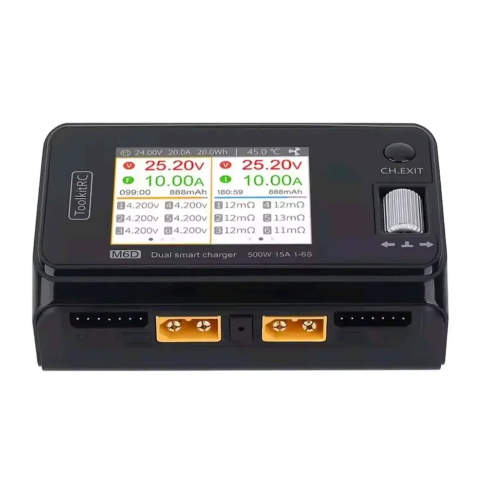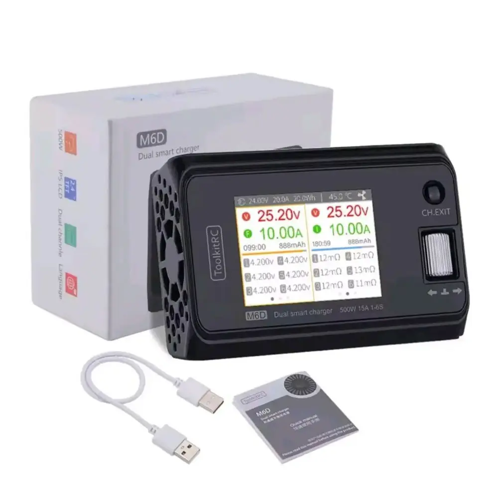 ToolkitRC M6D – це потужний зарядний пристрій нового покоління, що дозволяє заряджати дві батареї одночасно з максимальною точністю, контролем і безпекою. Оснащений яскравим кольоровим IPS-дисплеєм 2.4″, інтуїтивно зрозумілим меню та вентиляцією з активним охолодженням, цей зарядник стане незамінним інструментом для всіх, хто займається FPV, RC-моделізмом чи робототехнікою.